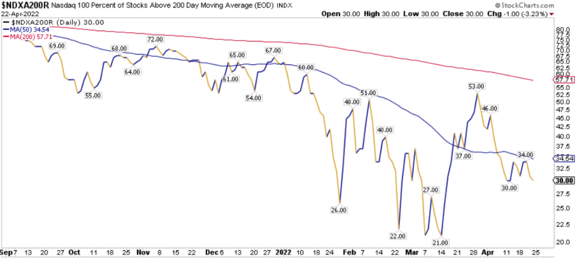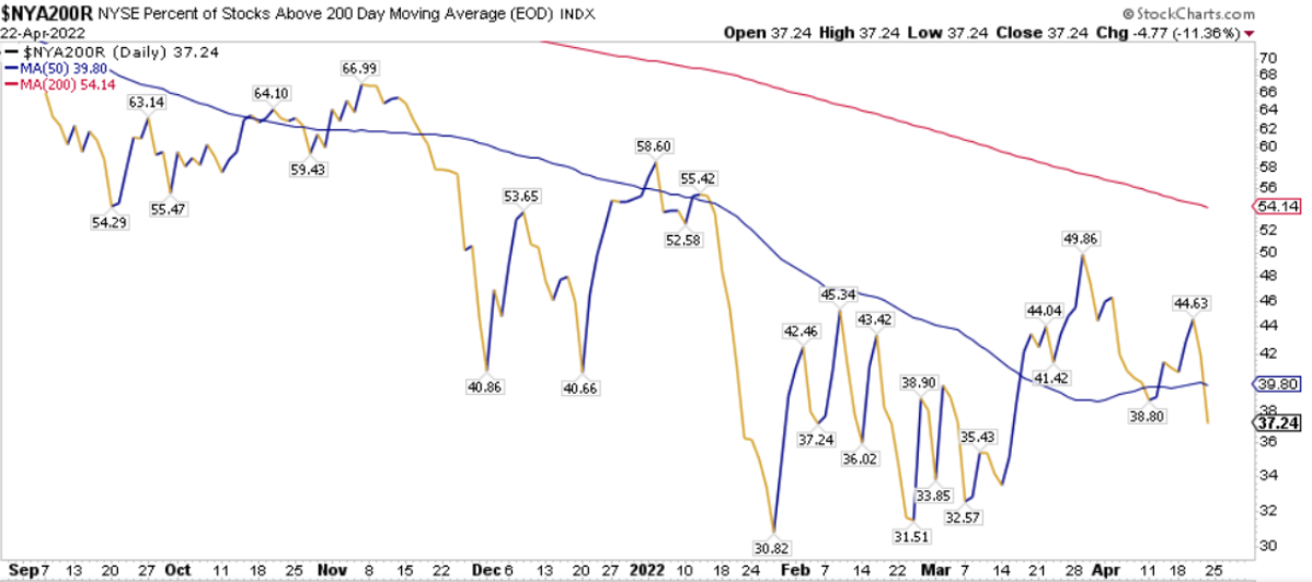 La percentuale dei titoli S&P500 scambiati sopra la loro media mobile a 200 periodi è pari al 44.49%, sul Nasdaq100 il 30.00% dei titoli prezza sopra lo stesso indicatore, mentre sul NYSE la percentuale è pari al 37.24%.