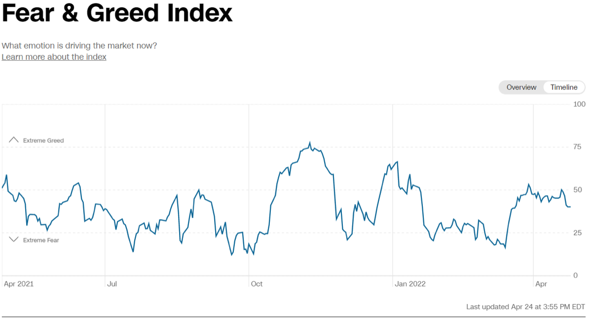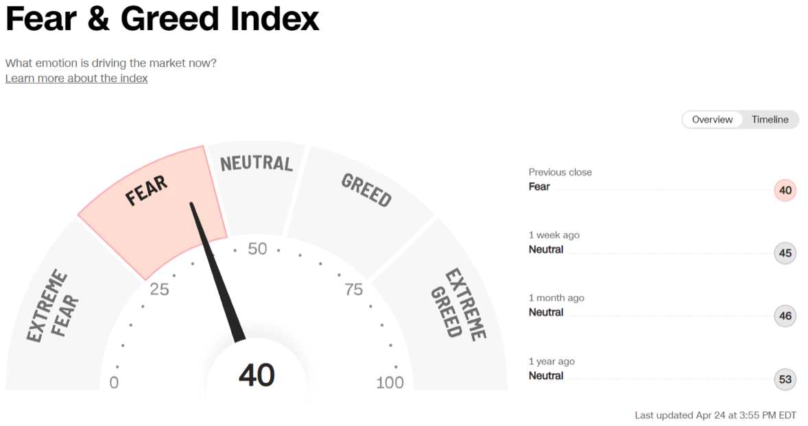Il Fear&Greed Index scende a quota 40, indicando la paura come sentiment prevalente. Una settimana fa il valore era pari a 45.