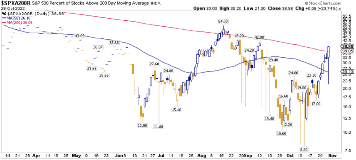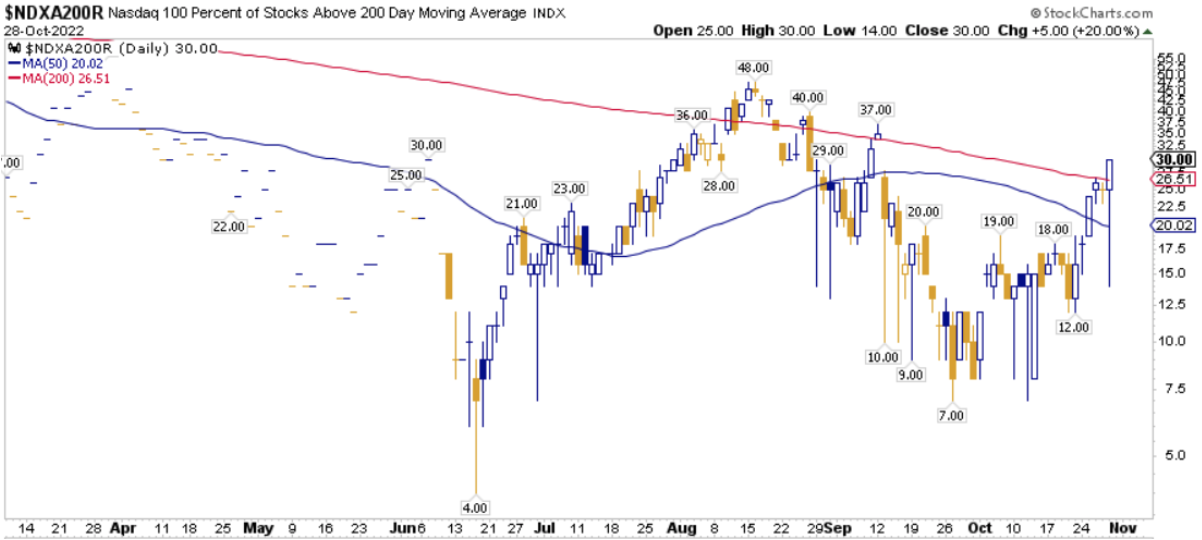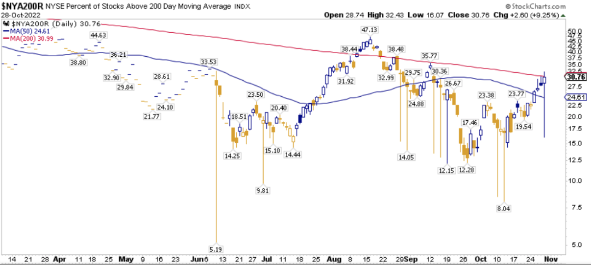 La percentuale dei titoli S&P500 scambiati sopra la loro media mobile a 200 periodi è pari al 38.88%, sul Nasdaq100 il 30.00% dei titoli prezza sopra lo stesso indicatore, mentre sul NYSE la percentuale è pari al 30.76%.
