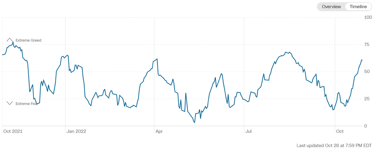 Il Fear&Greed Index sale a quota 61, indicando l’ avidità come sentiment prevalente. Una settimana fa il valore era pari a 45.