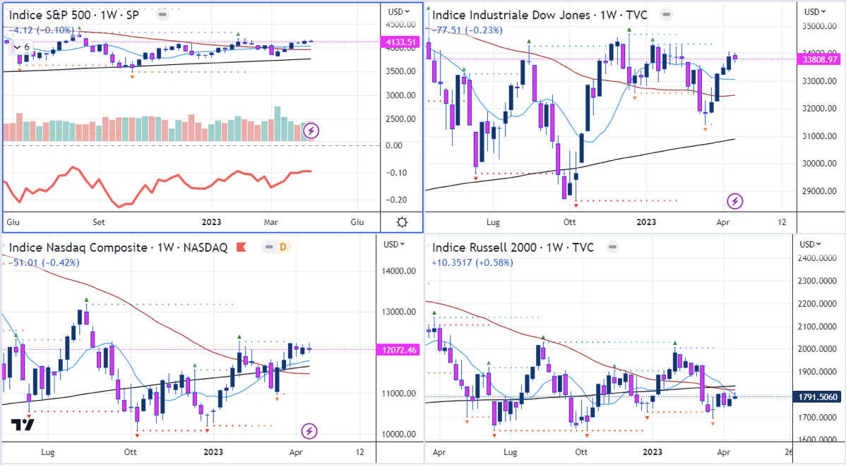 Mercati ancora una volta poco mossi a livello settimanale, ma caratterizzati da ampi swing intraday. La sensazione è quella di un’attesa, forse per il meeting della FED del 3 maggio, forse per la nuova ondata di trimestrali in arrivo.