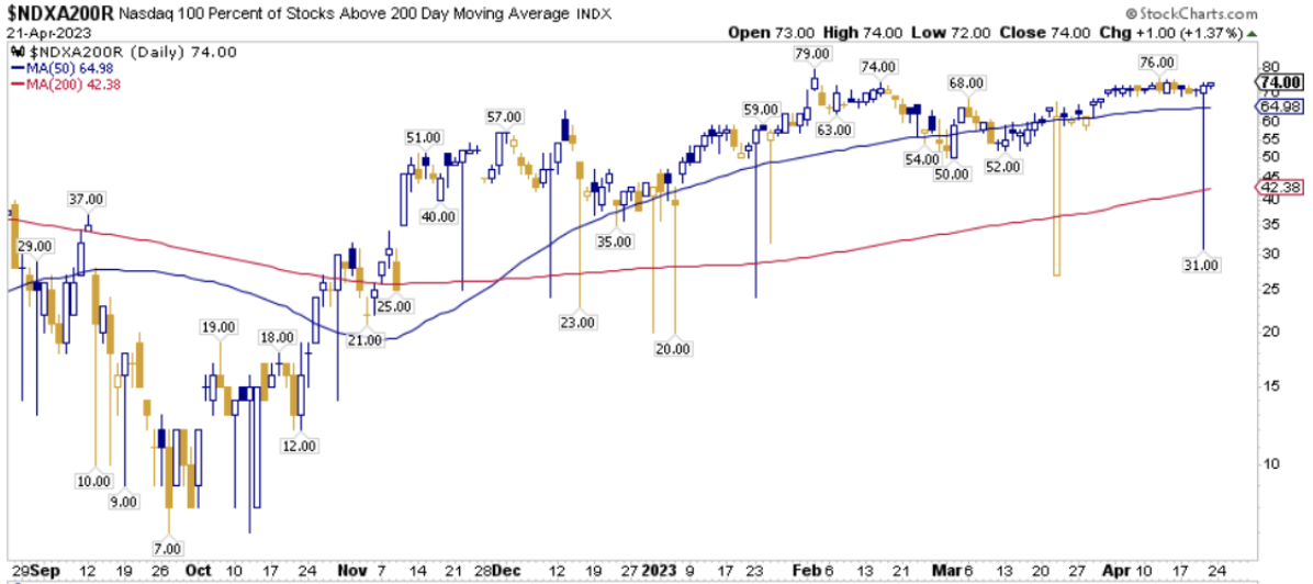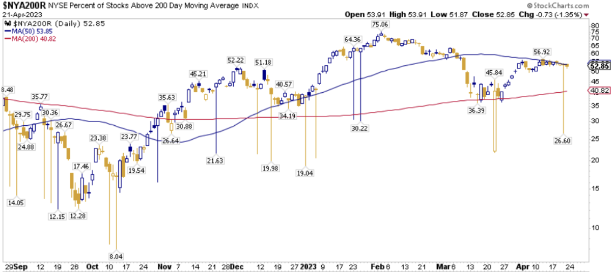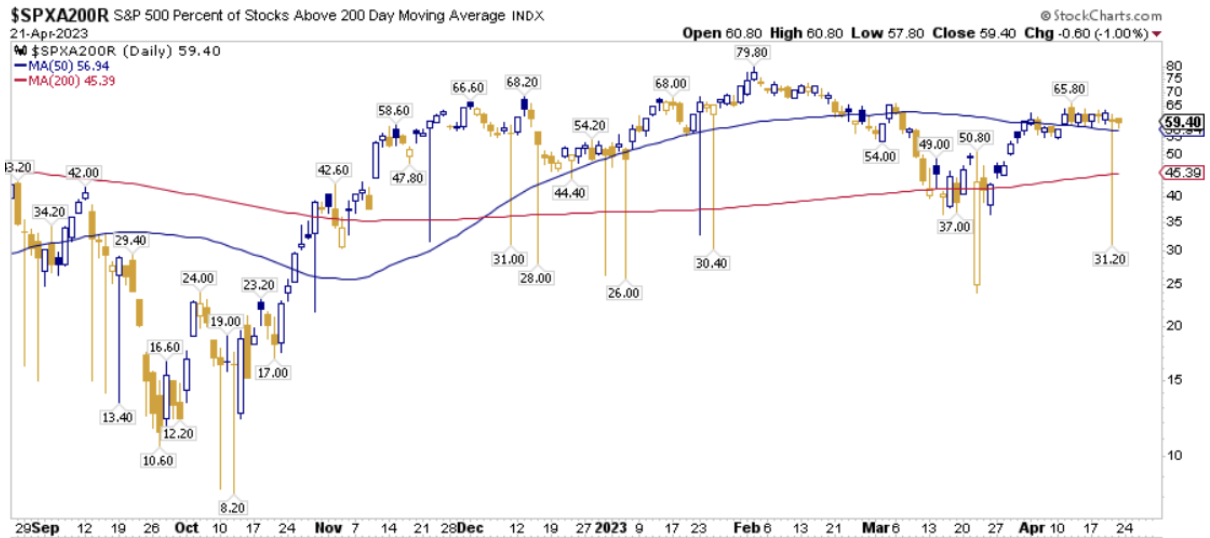 La percentuale dei titoli S&P500 scambiati sopra la loro media mobile a 200 periodi è pari al  59.40%, sul Nasdaq100 il 74.00% dei titoli prezza sopra lo stesso indicatore, mentre sul NYSE la percentuale è pari al 52.85%.