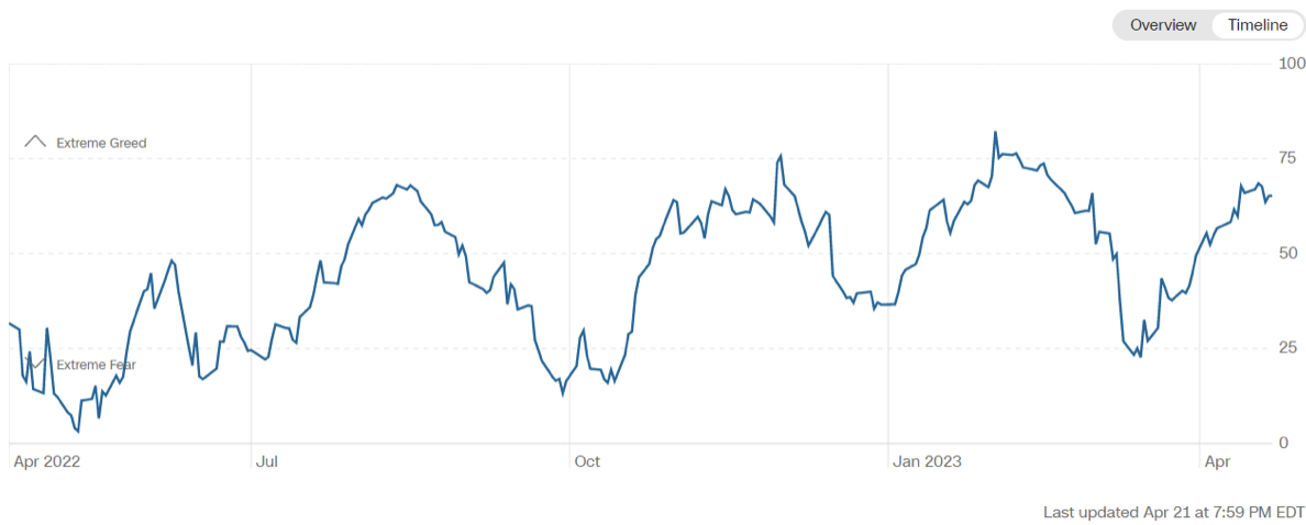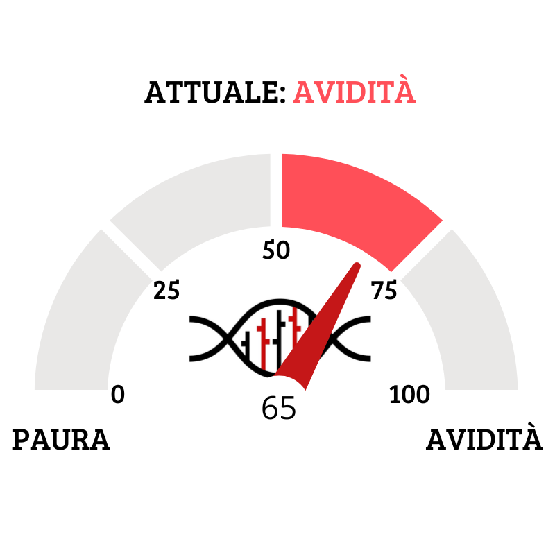 Il Fear&Greed Index stabile a quota 65, indica l’avidità come sentiment prevalente. Una settimana fa il valore era pari a 67.