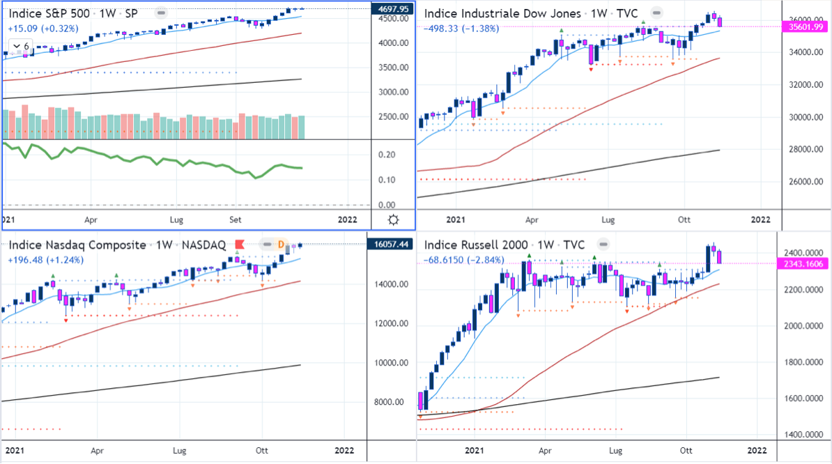 Il Dow e soprattutto il Russell2000 hanno cominciato a ritracciare nelle ultime due settimane e si stanno avvicinando alle rispettive SMA50D, appesantiti da finanziari ed energetici. Proprio XLE e XLF hanno tagliato a ribasso le loro medie Venerdì.