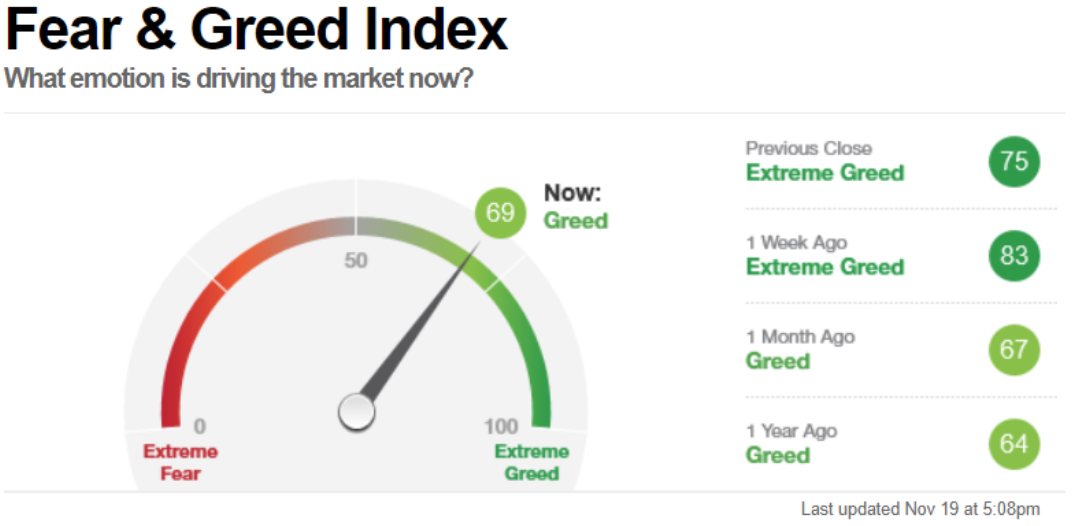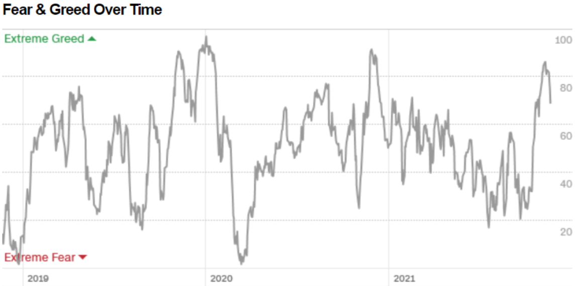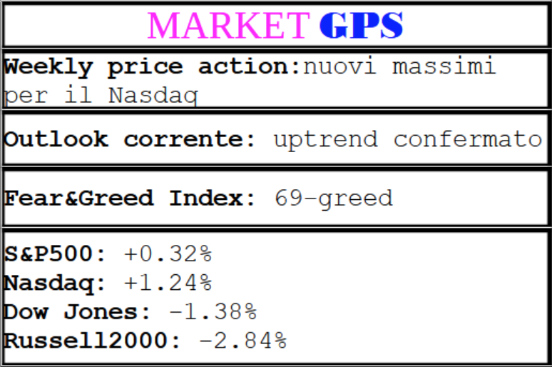 Il Fear&Greed Index scende a quota 69, indicando l’avidità come sentiment prevalente. Una settimana fa il valore era pari a 83.