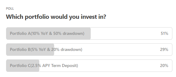 2) Il portafoglio B funziona esattamente allo stesso modo, ma rende solo il 5% e ha un drawdown relativamente più basso, pari al 20%.
