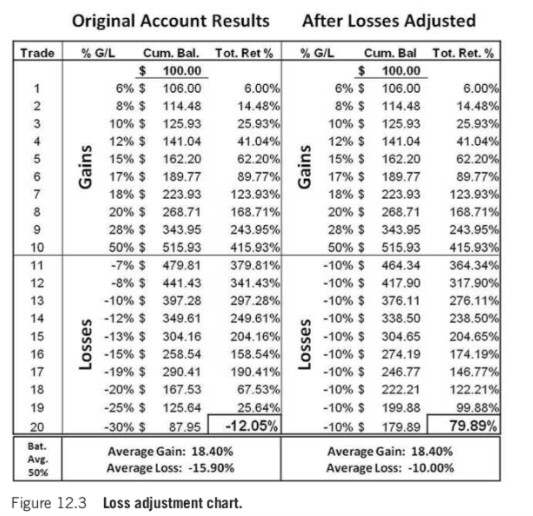 Si vede in maniera molto chiara come, nonostante un guadagno medio del 18.40% in entrambi i casi, nel primo caso con uno stop loss variabile fra il -7% e il -30% con uno stop loss medio del 15.90% il rendimento finale dopo 20 trade è negativo e s finisce per avere una perdita del -12.05%.