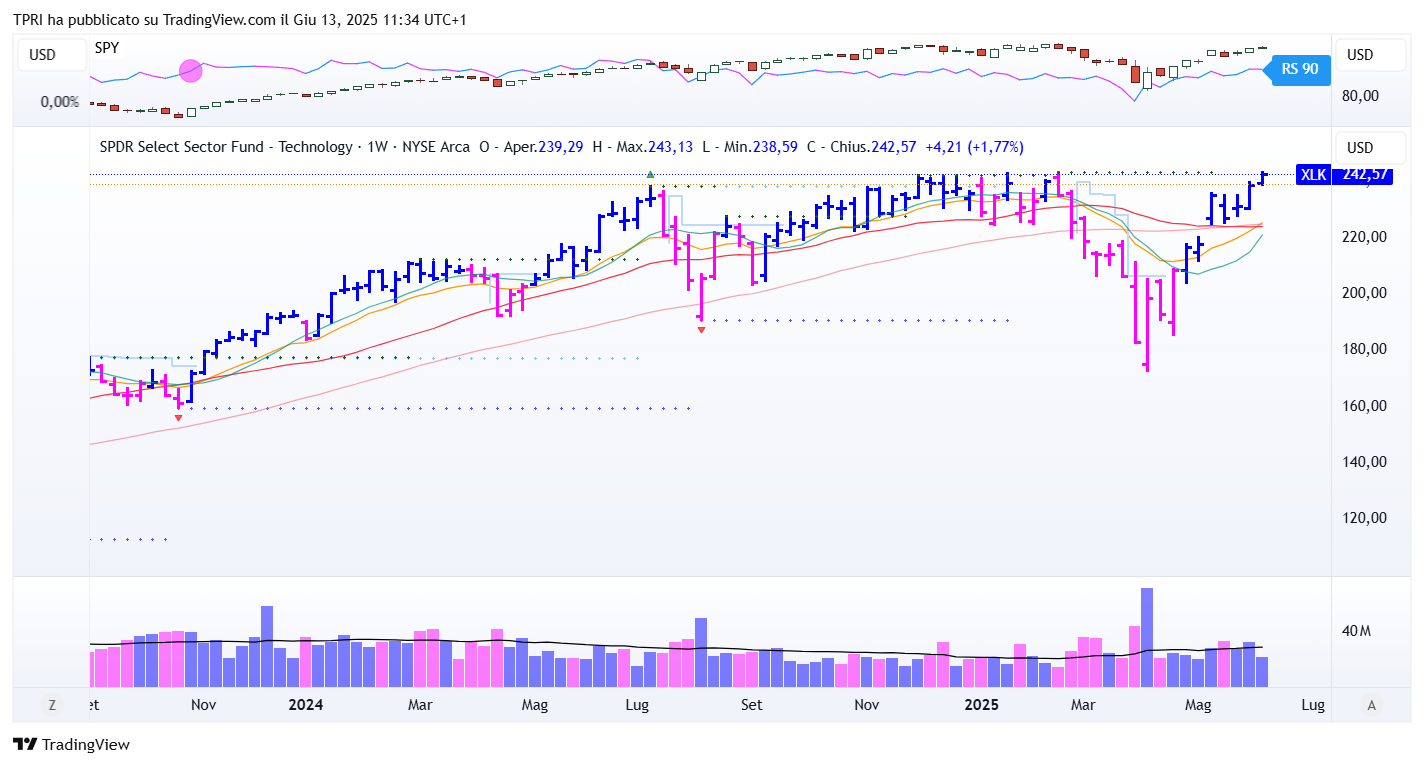 Tuttavia, il rimbalzo più forte si è visto proprio nel settore tecnologico, con gli investitori che tornavano a focalizzarsi sulla narrativa della spesa eccezionale in infrastrutture di IA, ulteriormente supportata dal superamento delle previsioni di utili di Nvidia nell’ultima settimana di maggio. Non è un caso che $XLK abbia registrato una nuova chiusura record il 12 giugno.