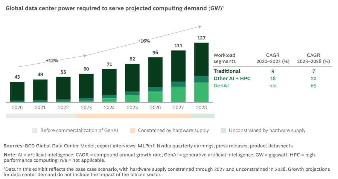 All’interno della previsione di BCG, la domanda di energia per l’IA generativa è stimata crescere a un CAGR del 65%, con l’addestramento di IA che aumenta a un CAGR del 30% e l’inferenza che cresce rapidamente a un CAGR del 122%. Entro il 2028, BCG stima che l’IA generativa rappresenterà oltre un terzo della domanda globale di energia dei data center.