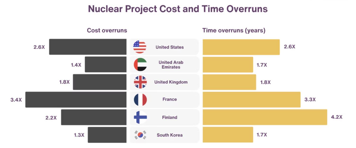 • Superamenti di costi e tempi: i progetti nucleari spesso vedono ritardi e costi superiori alle aspettative, e questo non è isolato agli Stati Uniti. Secondo l’IEA, i progetti nucleari negli Stati Uniti spesso vedono superamenti fino a 2,6 volte su costi e tempi in anni, mentre la Francia vede superamenti superiori a 3 volte. Il punto di pareggio per le nuove costruzioni tende a essere circa 30 anni dopo l’inizio dei lavori, con superamenti che potrebbero spingere questo ancora più lontano nel futuro. I progetti di centrali nucleari spesso affrontano significativi superamenti di tempi e costi, prolungando i già lunghi tempi di costruzione e aggiungendo a costi elevati.