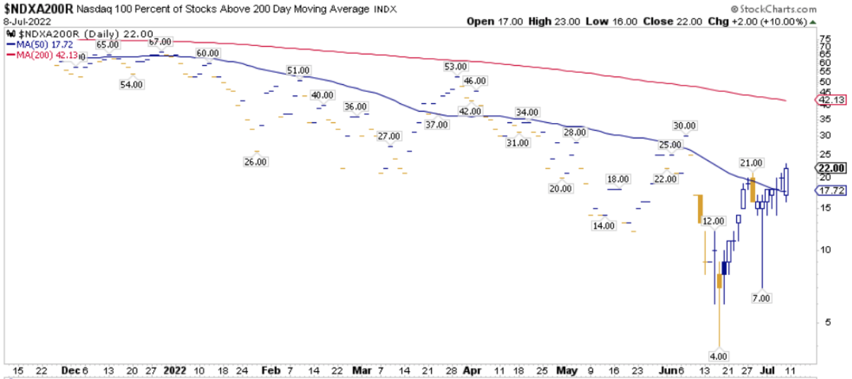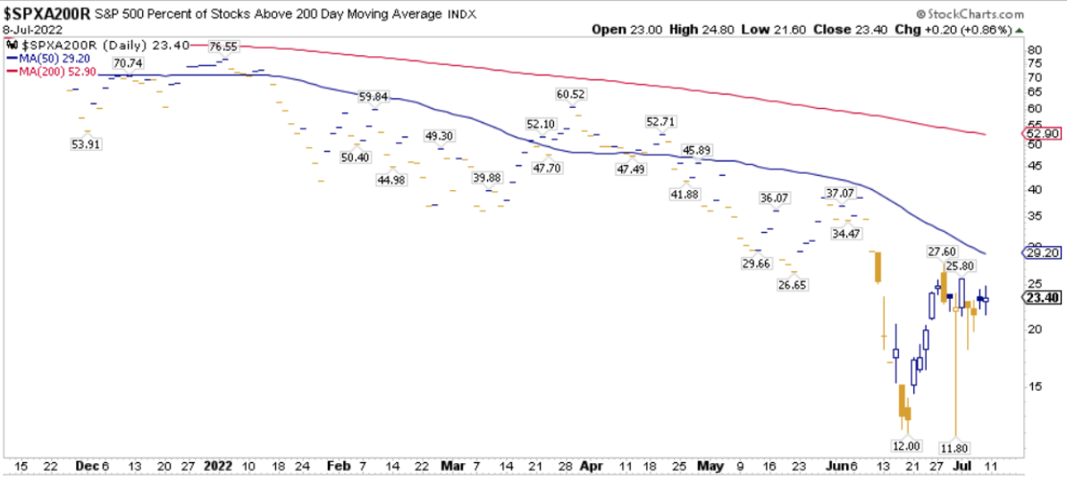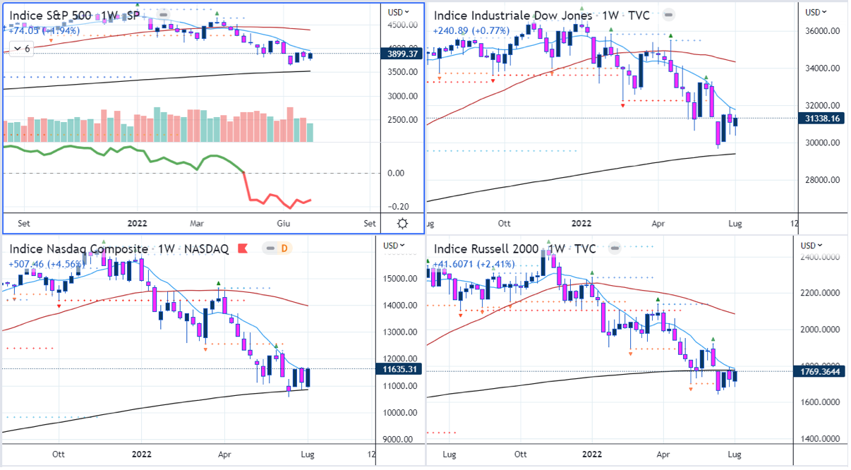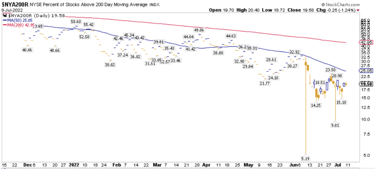 La percentuale dei titoli S&P500 scambiati sopra la loro media mobile a 200 periodi è pari al 23.40%, sul Nasdaq100 il 22.00% dei titoli prezza sopra lo stesso indicatore, mentre sul NYSE la percentuale è pari al 19.58%.