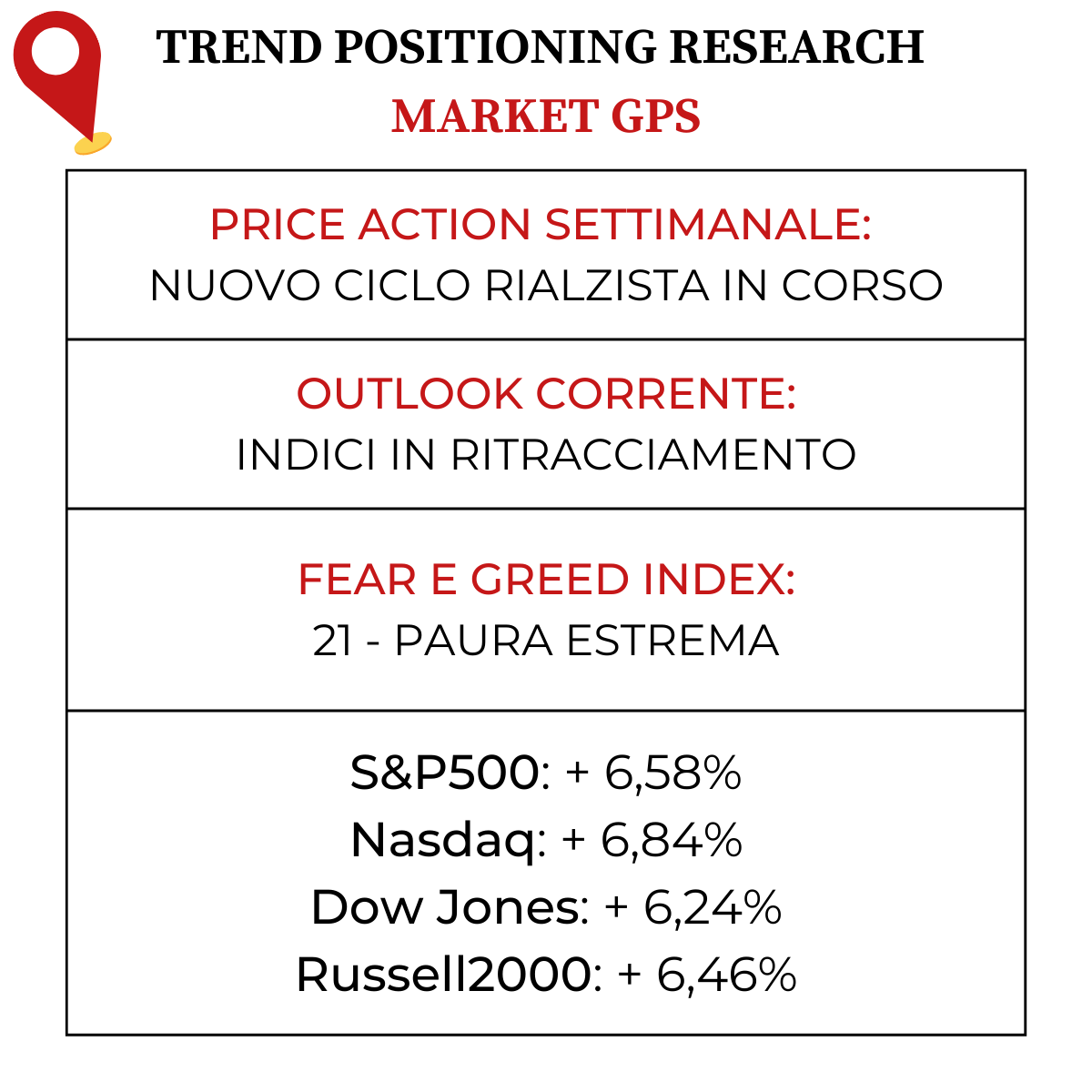 Indici finalmente in positivo dopo settimane in rosso e quotazioni che tornano sopra la EMA21D su Nasdaq, S&P500, Dow Jones e Russell2000. Venerdì abbiamo avuto il primo giorno del nuovo ciclo rialzista, nonostante manchi ancora una conferma per quanto riguarda il rally da parte del position day. Attenzione però a non sovraesporsi in un mercato ancora incerto e caratterizzato da forte volatilità di breve periodo.