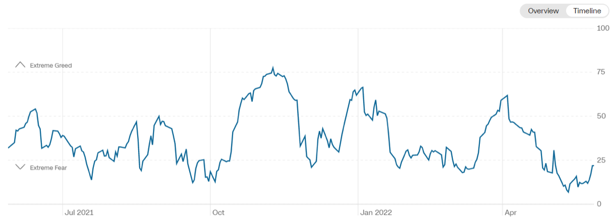 Il Fear&Greed Index sale a quota 21, indicando la paura estrema come sentiment prevalente. Una settimana fa il valore era pari a 11.