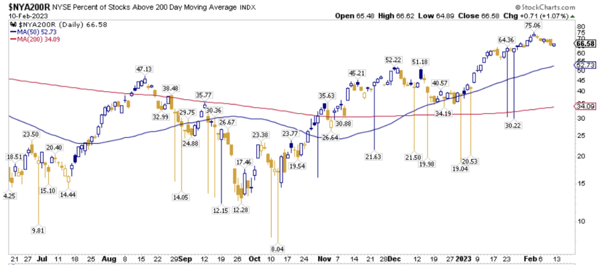 La percentuale dei titoli S&P500 scambiati sopra la loro media mobile a 200 periodi è pari al 70.80%, sul Nasdaq100 il 67.00% dei titoli prezza sopra lo stesso indicatore, mentre sul NYSE la percentuale è pari al 66.58%.