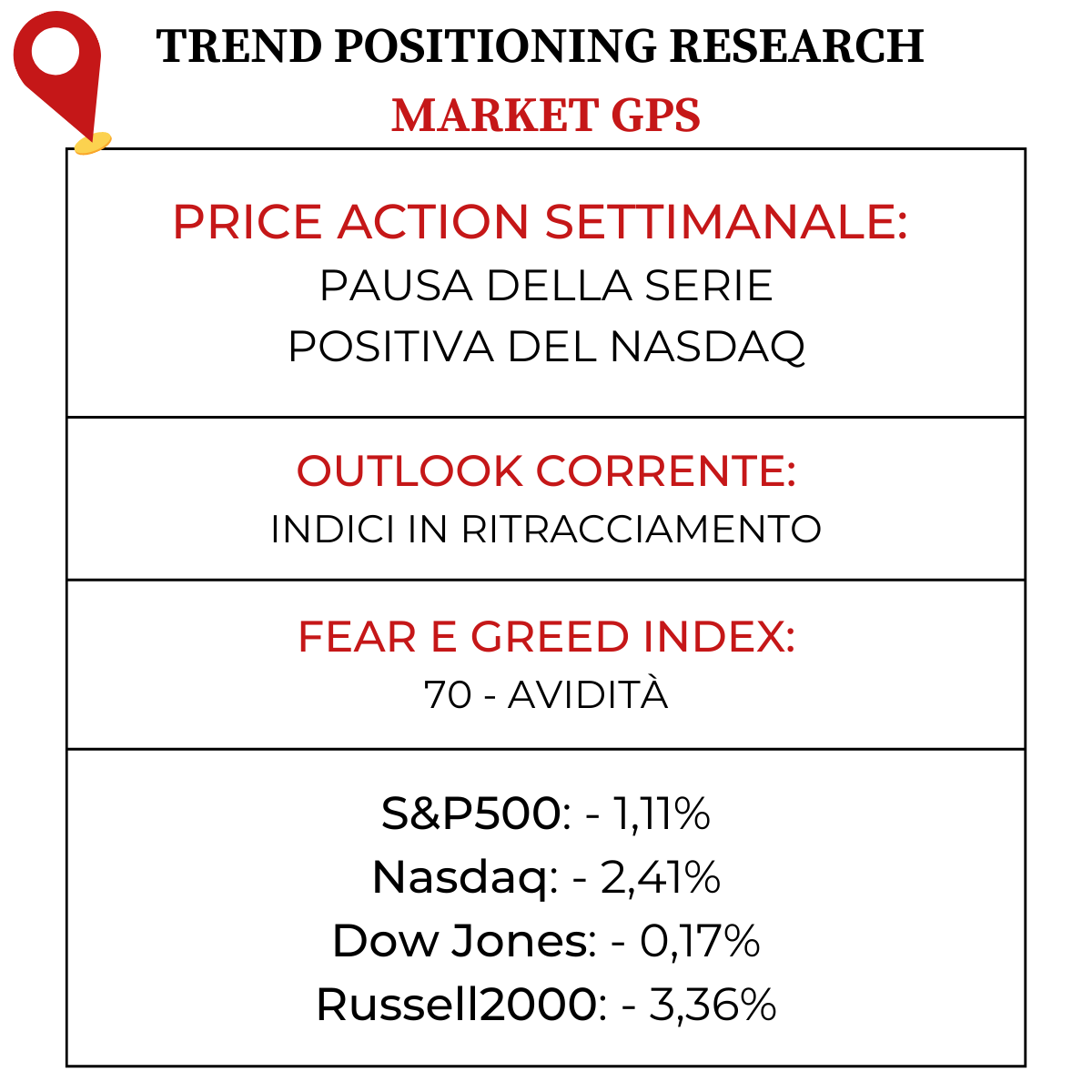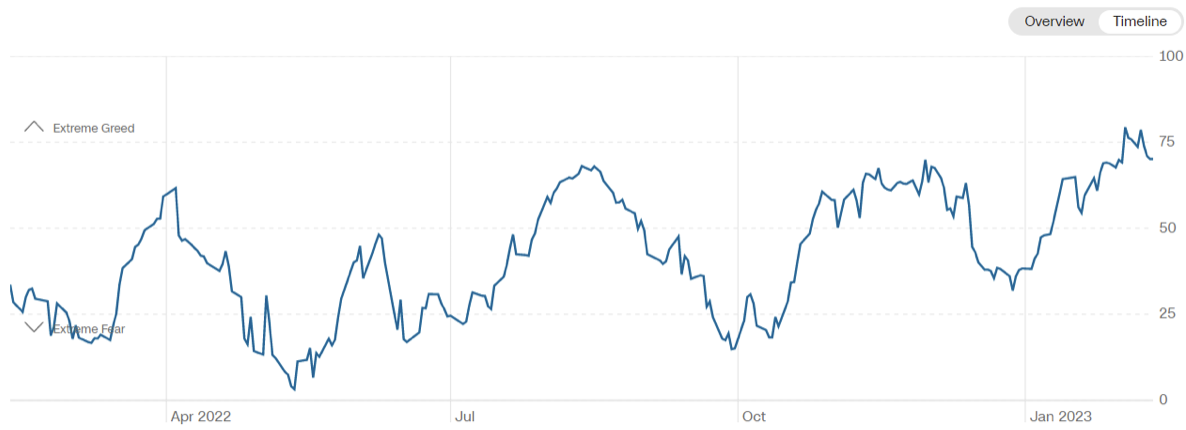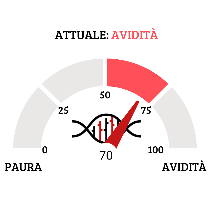 Il Fear&Greed Index scende a quota 70, indicando l’avidità come sentiment prevalente. Una settimana fa il valore era pari a 76.