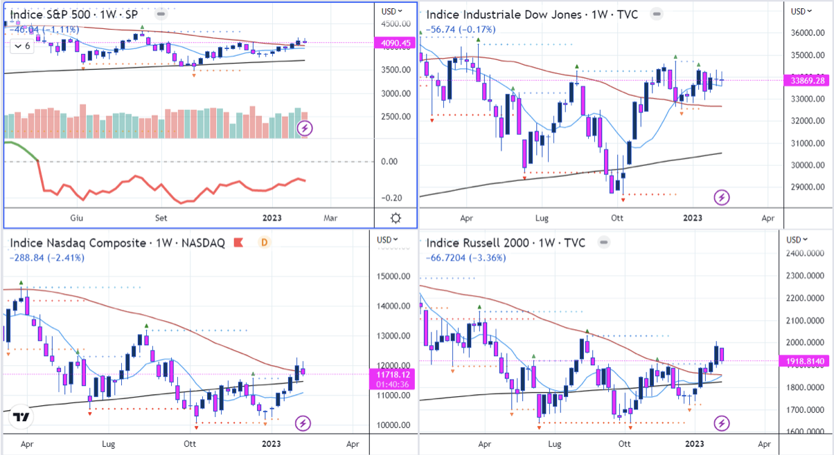 Tutti gli indici hanno corretto la rotta a ribasso, con Nasdaq, S&P500 e Russell2000 che hanno trovato supporto intorno alle rispettive EMA21D.
