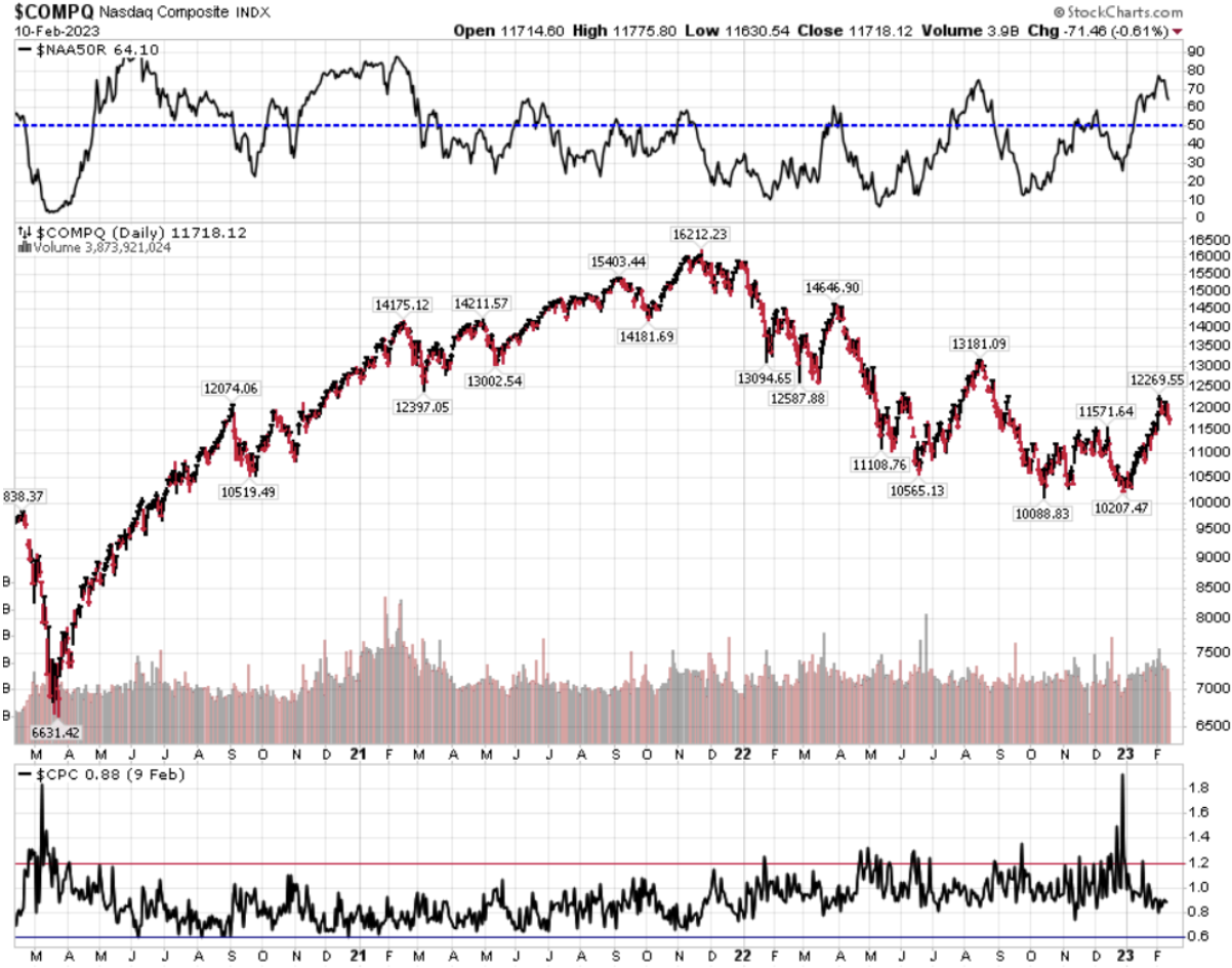Divergenza $NAAR50 vs $COMP: diminuzione della percentuale di titoli che prezzano sopra la SMA50 rispetto alla settimana precedente, in convergenza con il calo dell’indice.