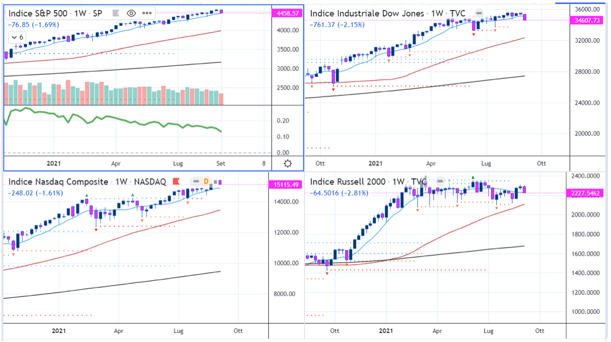 Nel complesso Dow, S&P500 e Russell2000 hanno chiuso in negativo per cinque sessioni consecutive, mentre il Nasdaq per tre. Particolarmente negativa la price action di Giovedì e Venerdì che ha mostrato chiusure sui minimi di giornata. Dow e Russell2000 nuovamente sotto la SMA50D, mentre l’S&P500 si trova adesso sotto la EMA21D non lontano dalla SMA50D, ma anche dai massimi storici. Il supporto dinamico ha invece resistito sul Nasdaq.