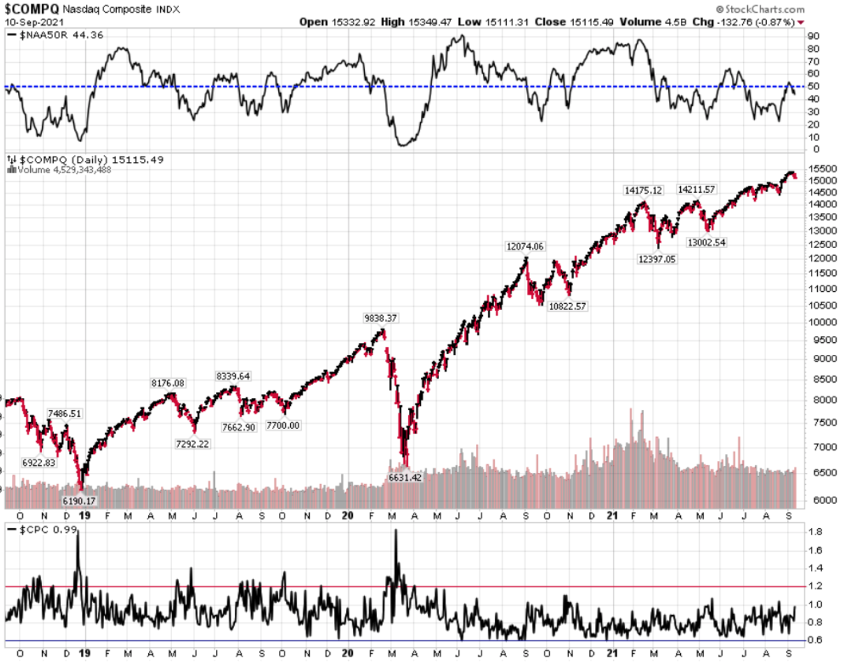 Divergenza $NAAR50 vs $COMP: calo della percentuale di titoli che prezzano sopra la SMA50 in linea con la discesa dell’indice.
