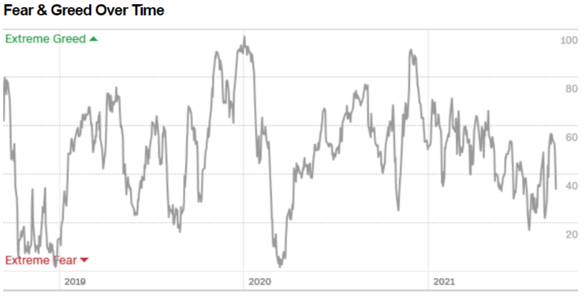 Il Fear&Greed Index scende a quota 34, indicando la paura come sentiment prevalente. Una settimana fa il valore era pari a 54.