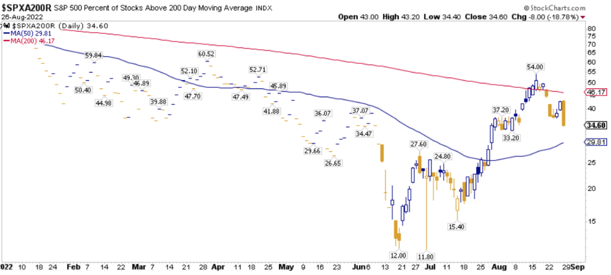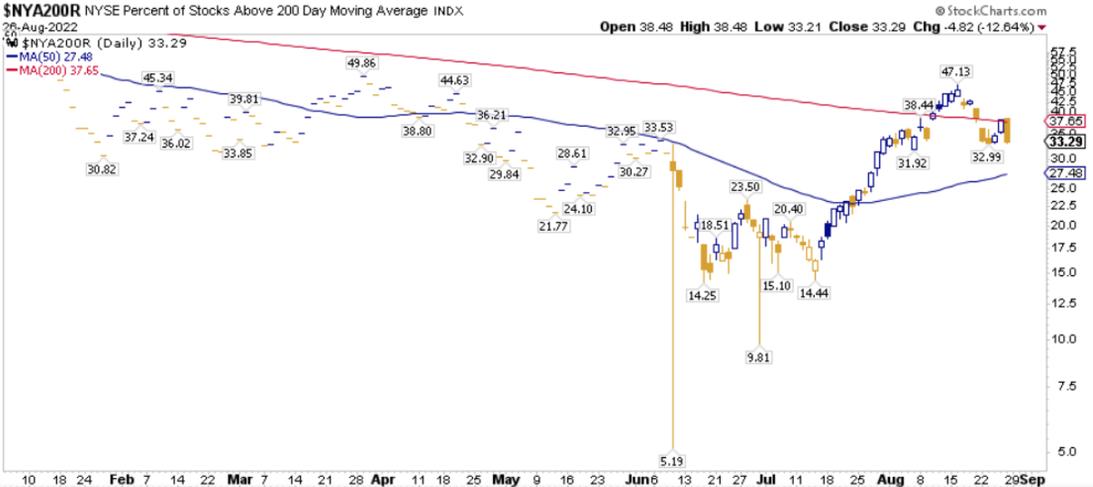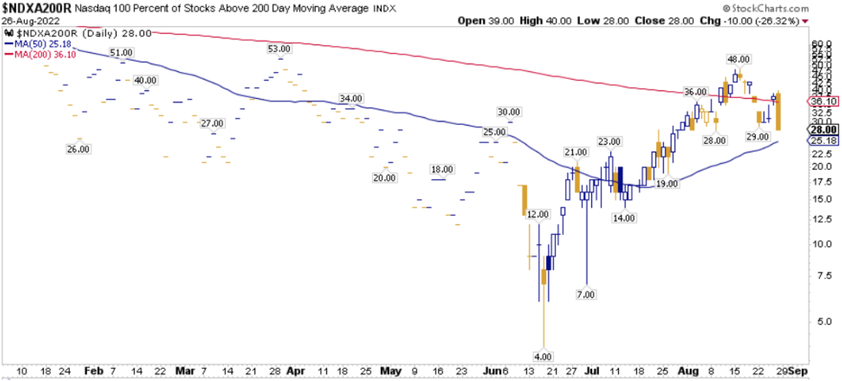 La percentuale dei titoli S&P500 scambiati sopra la loro media mobile a 200 periodi è pari al 34.60%, sul Nasdaq100 il 28.00% dei titoli prezza sopra lo stesso indicatore, mentre sul NYSE la percentuale è pari al 33.29%.