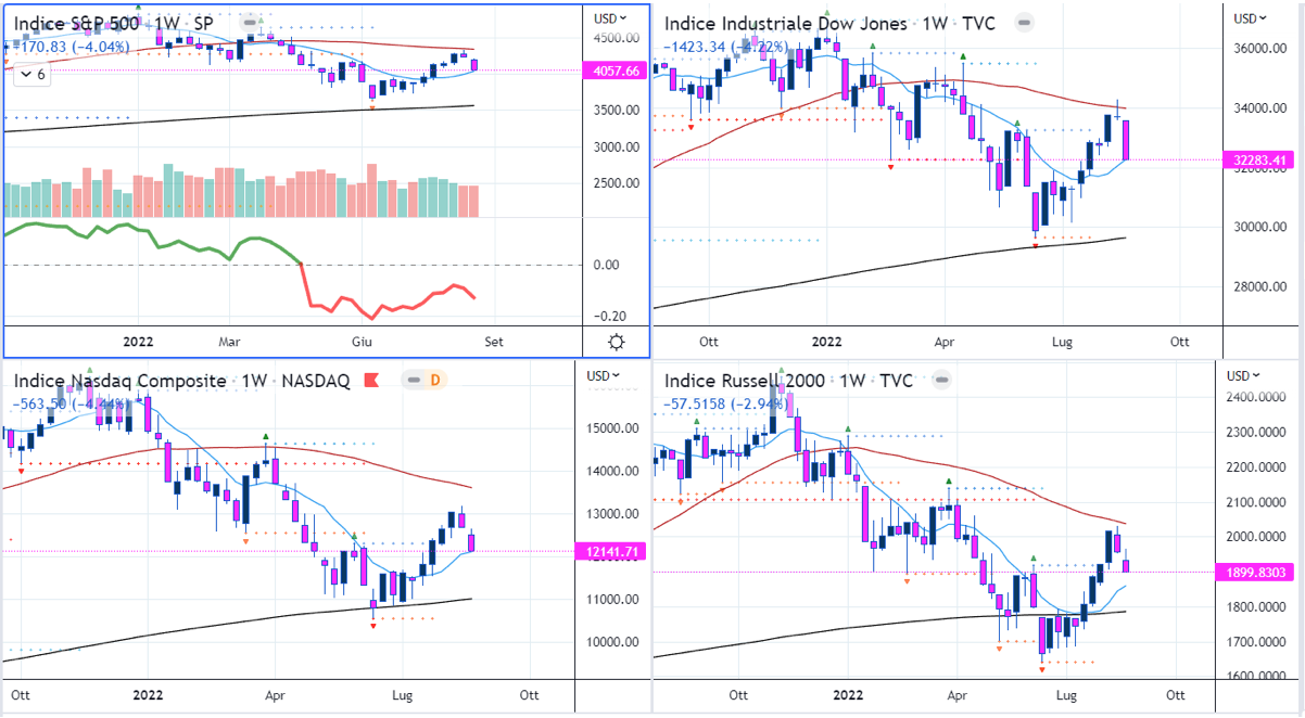 Settimana negativa per gli indici, che avevano cominciato la settimana in gap-down e chiuso vicino ai minimi di giornata. Il tentativo di rimbalzo nelle giornate successive non è andato a buon fine (bloccato da un’area di resistenza chiave) e le quotazioni sono poi crollate Venerdì dopo il discorso “hawkish” al meeting di Jackson Hole.