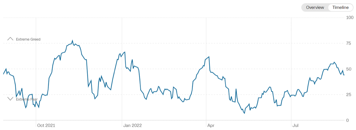 Il Fear&Greed Index scende a quota 44, indicando la paura come emozione prevalente. Una settimana fa il valore era pari a 51.