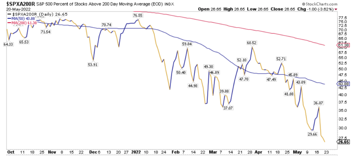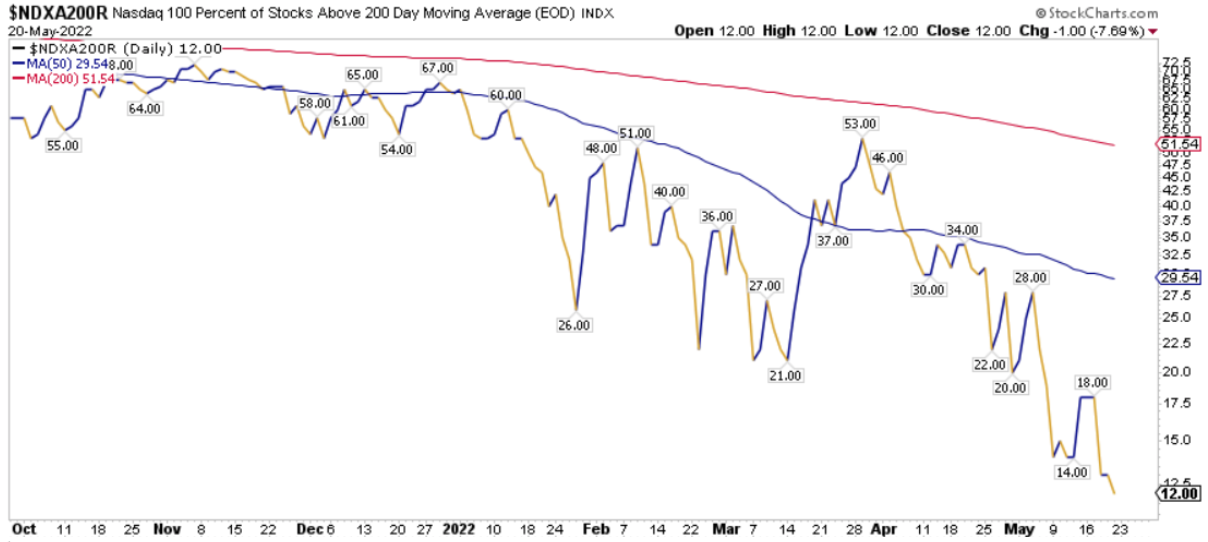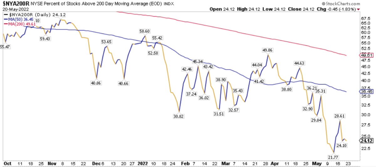 La percentuale dei titoli S&P500 scambiati sopra la loro media mobile a 200 periodi è pari al 26.65%, sul Nasdaq100 il 12.00% dei titoli prezza sopra lo stesso indicatore, mentre sul NYSE la percentuale è pari al 24.12%.