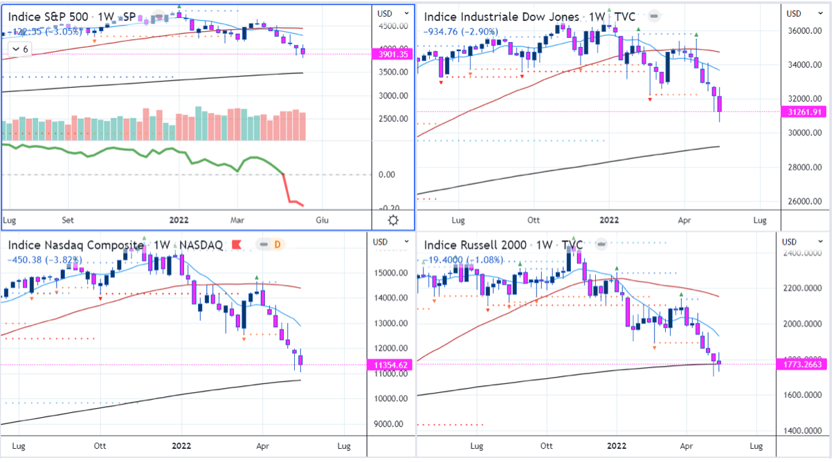 Allargando lo zoom ai grafici settimanali vediamo un costante sell-off da ormai inizio Aprile.