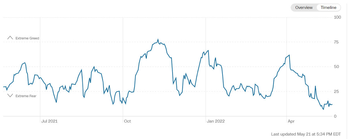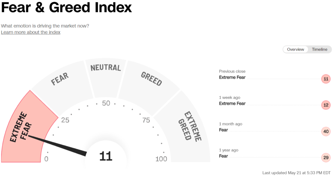 Il Fear&Greed Index scende a quota 11, indicando la paura estrema come sentiment prevalente. Una settimana fa il valore era pari a 12.