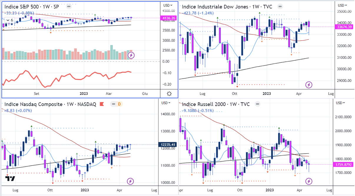 Guardando agli equal weighted, il QQEW è tornato sopra le SMA50D e EMA21D, mentre l’RSP ha chiuso la settimana in negativo con le quotazioni intrappolate tra SMA200D e SMA50D.