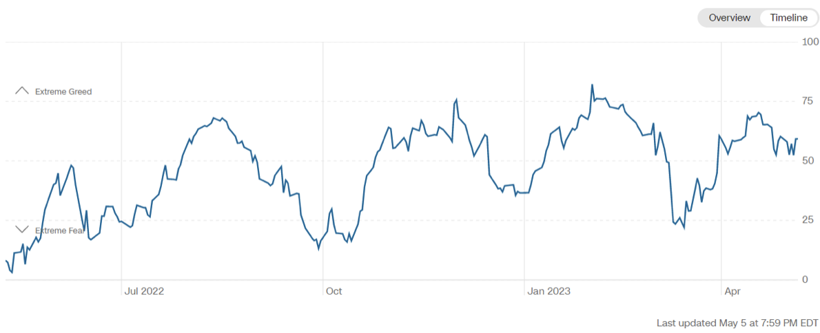 Il Fear&Greed Index scende a quota 59, indicando l’avidità come sentiment prevalente. Una settimana fa il valore era pari a 60.