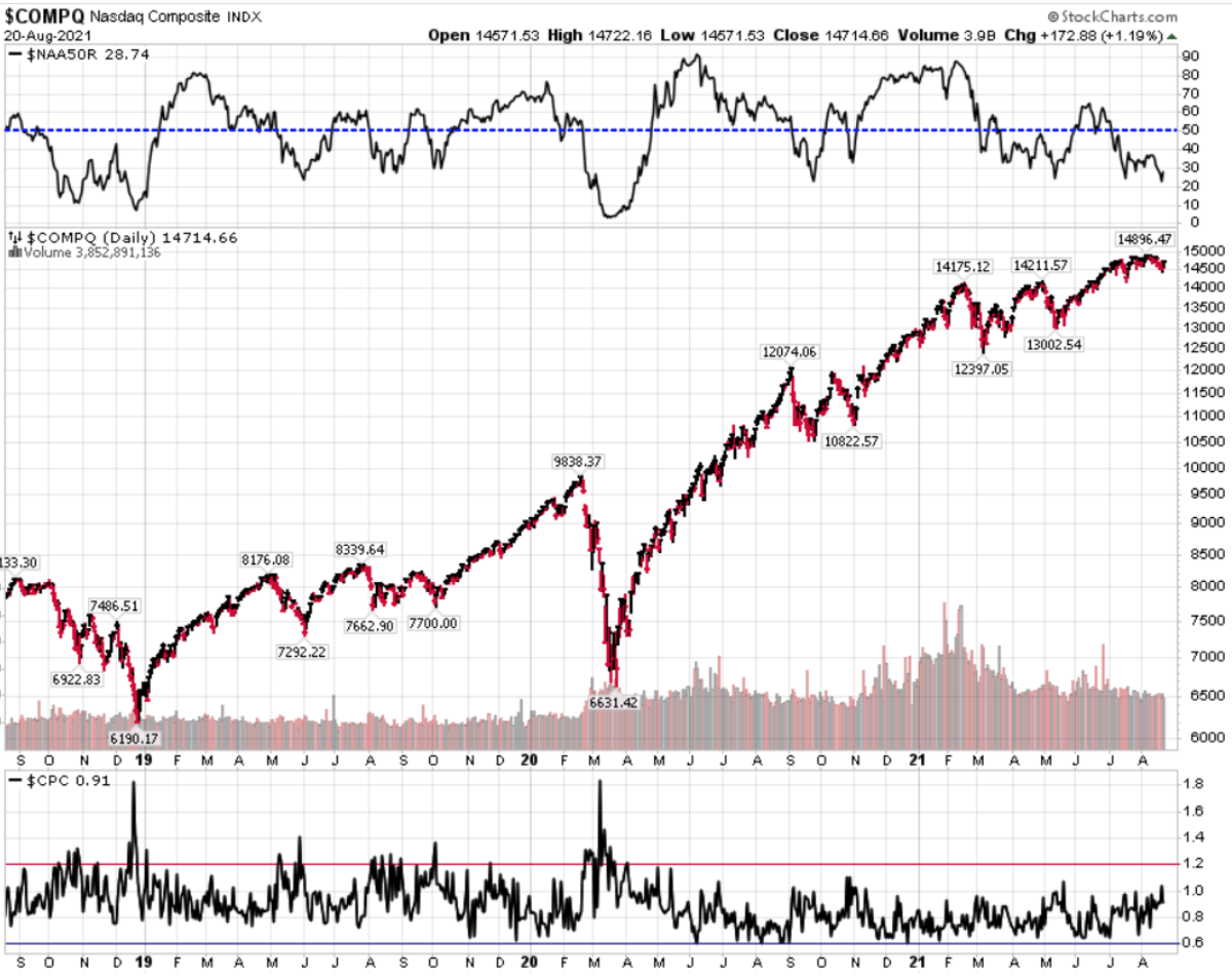 Divergenza $NAAR50 vs $COMP: diminuzione della percentuale di titoli che prezzano sopra la SMA50 in linea con il calo dell’indice.