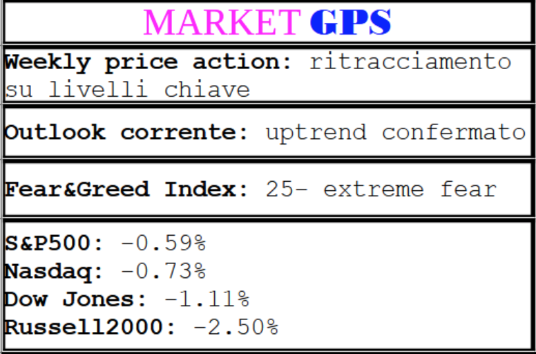 Put/Call Ratio=0.91 (vs 0.93): Indicatore contrarian che compara il numero totale delle put tradate giornalmente con quello delle call. Valori sopra 1.2 indicano possibili bottom, mentre valori estremamente bassi indicano l’accumulo di opzioni call da parte dei retail, e quindi una “eccessiva” euforia con possibile ritracciamento in arrivo.