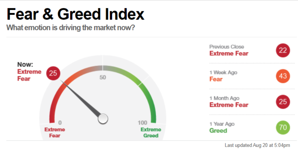 Il Fear&Greed Index scende a quota 25, indicando la paura estrema come sentiment prevalente. Una settimana fa il valore era pari a 43.