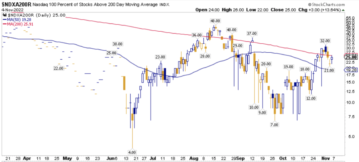 La percentuale dei titoli S&P500 scambiati sopra la loro media mobile a 200 periodi è pari al 37.20%, sul Nasdaq100 il 25.00% dei titoli prezza sopra lo stesso indicatore, mentre sul NYSE la percentuale è pari al 32.54%