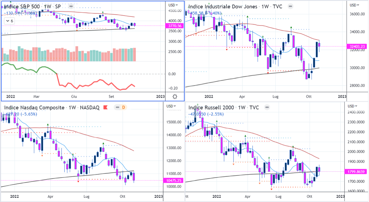 Il Dow Jones, che fino a questo momento aveva brillato, è già tornato sotto la SMA200D. Il Russell2000 non è riuscito a superare il medesimo livello, portandosi sopra la SMA50D durante il rimbalzo di Venerdì. SMA50D violata da parte dell’S&P500.