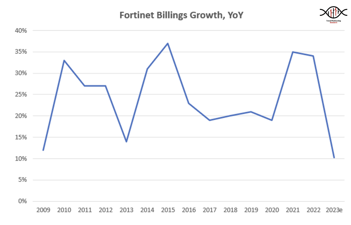 Il rallentamento delle previsioni di fatturato sono preoccupanti, poiché il 2023 segnerebbe la più lenta crescita di Fortinet dalla sua IPO nel 2009. La crescita è stimata a solo +10,2% su base annua al punto intermedio di 6,165 miliardi di dollari. Si tratta inoltre di un rallentamento significativo rispetto alla crescita del +34% e del +35% delle fatture registrata nel 2022 e nel 2021.