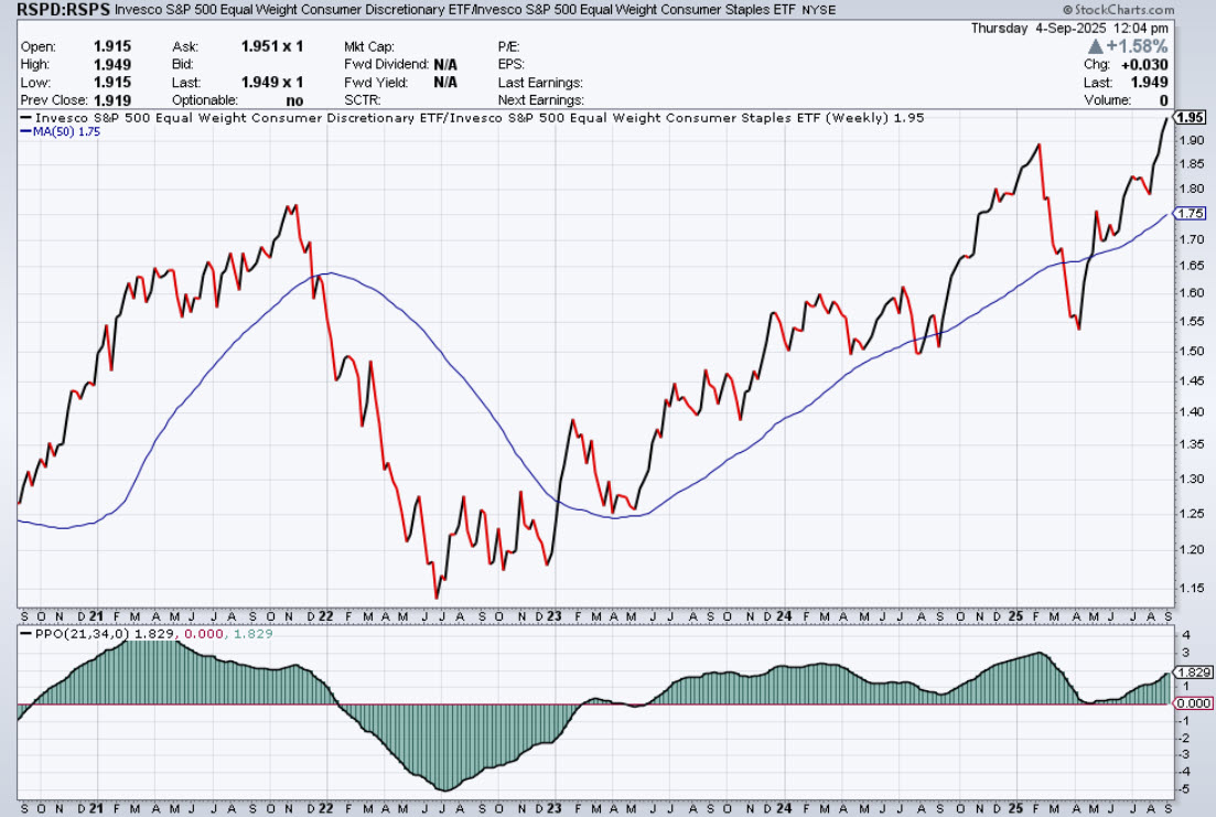 Una delle domande più frequenti oggi è se il bull market sia ancora vivo. Un indicatore utile per capirlo è il rapporto Consumer Discretionary vs Consumer Staples (ETF equal-weighted, RSPD/RSPS).