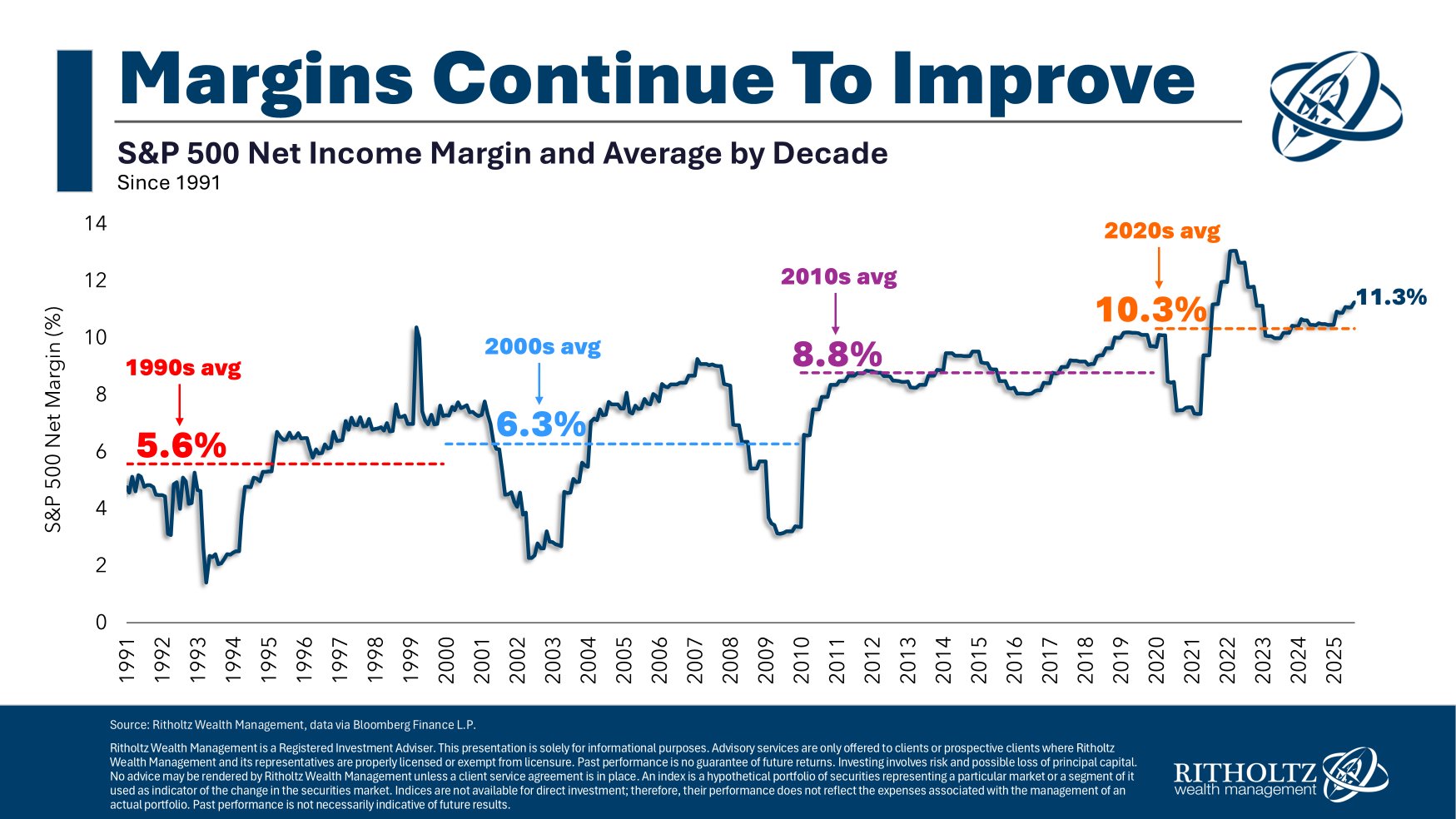 Negli anni ’90 i margini netti medi dello S&P 500 erano appena al 5,6%.