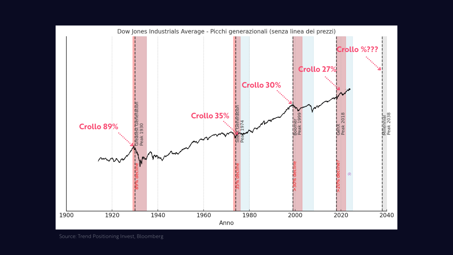 Il 1999 fu il picco dei Boomer. Il 1974 quello della Greatest Generation. La Gen X ha avuto il picco nel 2018. E i Millennial lo avranno nel 2035. Sono tappe indicative, ma ci dicono quando avvengono i grandi top di mercato.