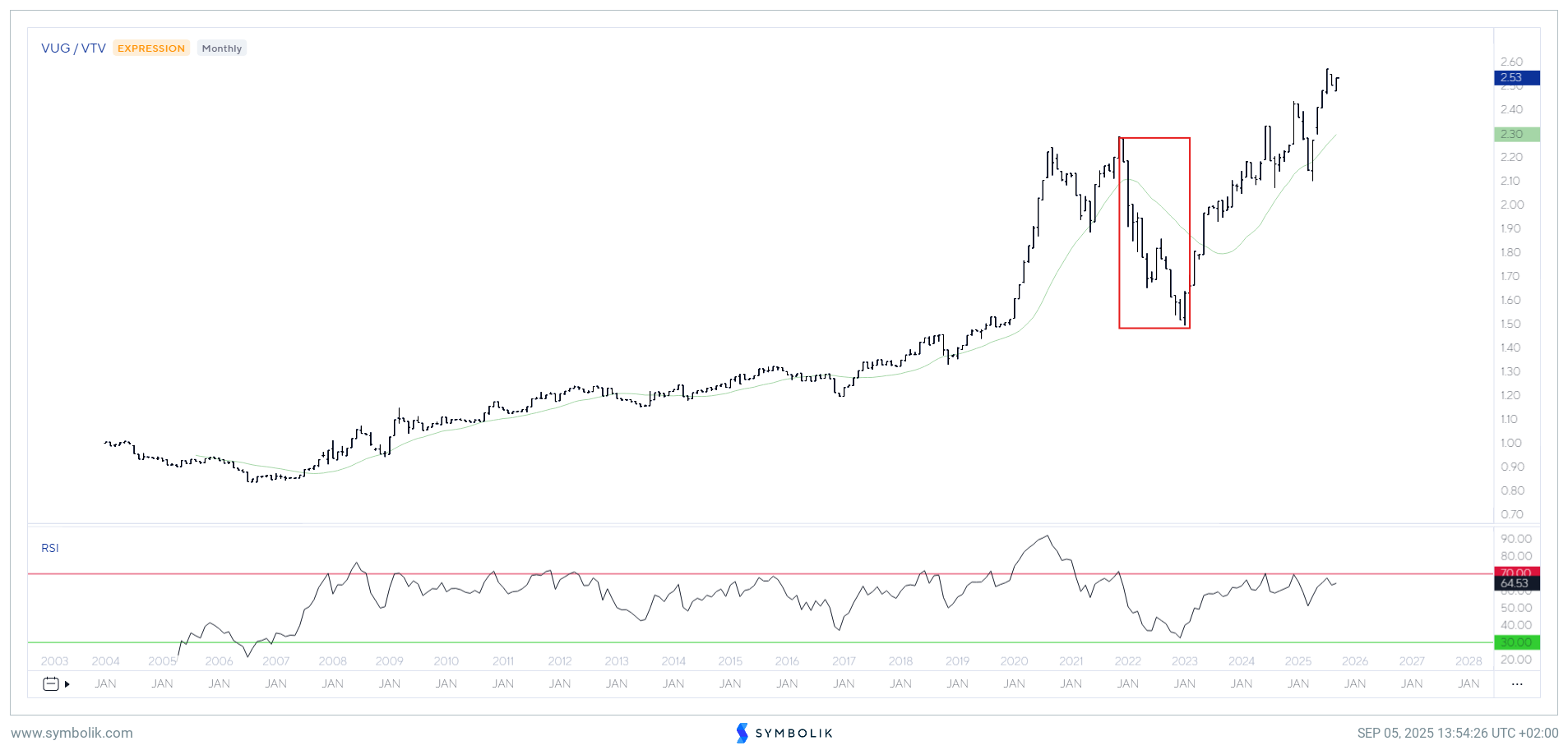 Guarda bene questo grafico mensile che parte dal 2003: il rapporto Growth vs Value è stato una lunga marcia verso l’alto, interrotta solo da brevi pause.
