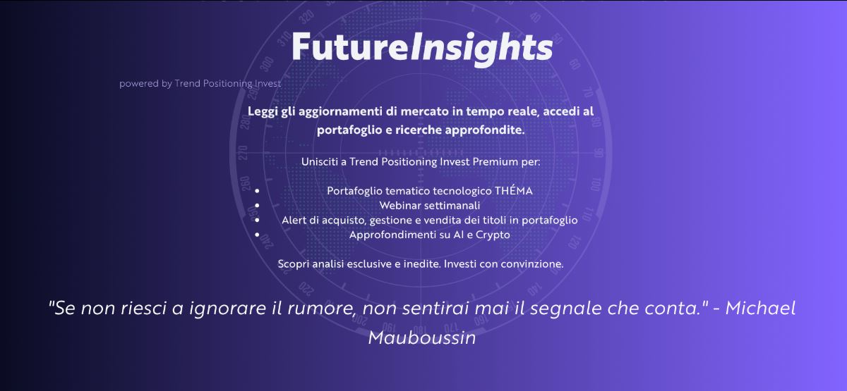 Nota: il Trend Positioning Invest conduce ricerche e formula conclusioni operative per il proprio Portafoglio Tematico Tecnologico THÉMA . Le informazioni condivise con i lettori non garantiscono performance delle azioni né costituiscono consulenza finanziaria. È consigliabile consultare il proprio consulente finanziario prima di investire.Vi invitiamo a fare le vostre analisi prima di acquistare azioni delle società eventualmente citate nei nostri canali.