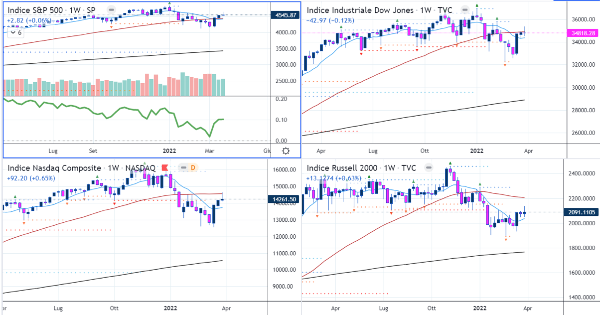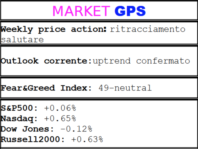 Price action dell’S&P500 quasi fotocopia rispetto a quella Nasdaq. Il benchmark si trova però già sopra la SMA200D e più vicino ai massimi storici.