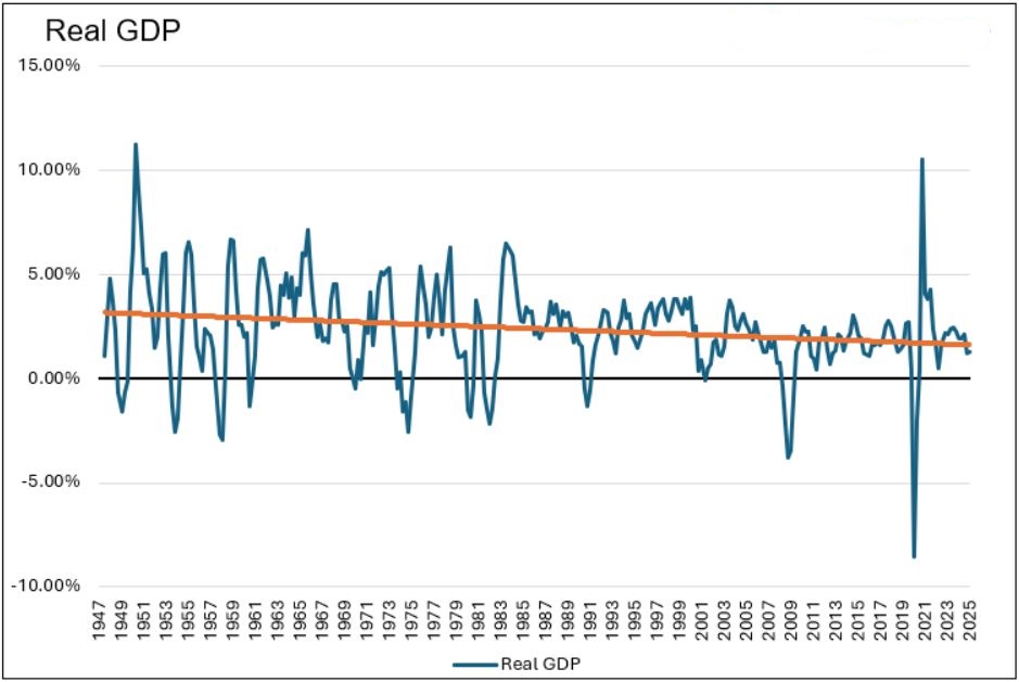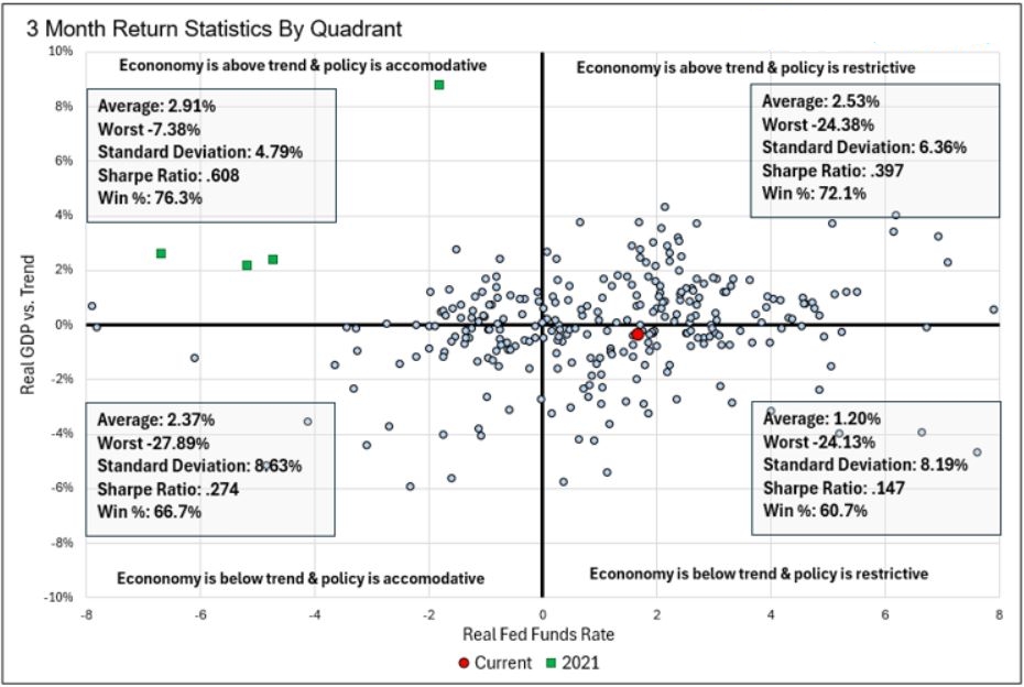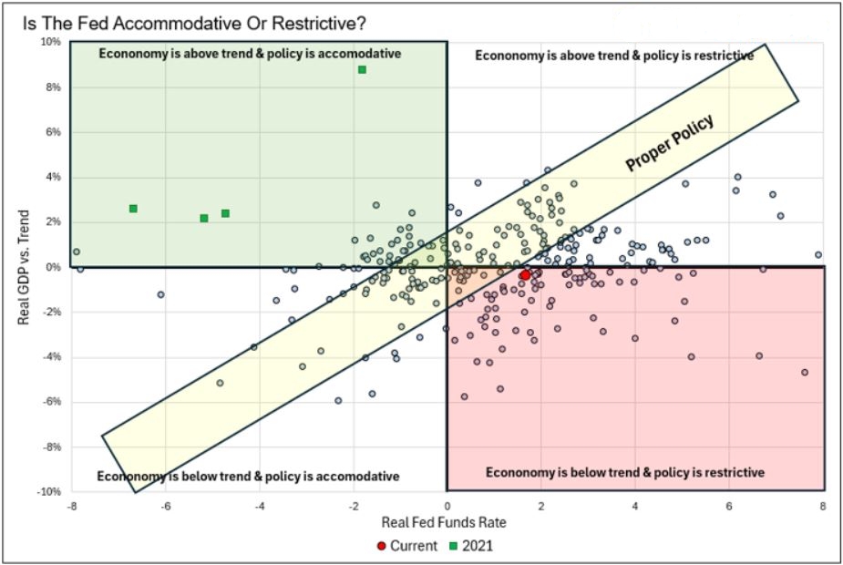 Sebbene la politica monetaria sia relativamente più accomodante rispetto al recente passato, rimane restrittiva in termini assoluti, come evidenziato dal fatto che il tasso sui Fed Funds supera l’inflazione (CPI) di circa 1,35% e la crescita economica è leggermente inferiore al trend di lungo periodo.
