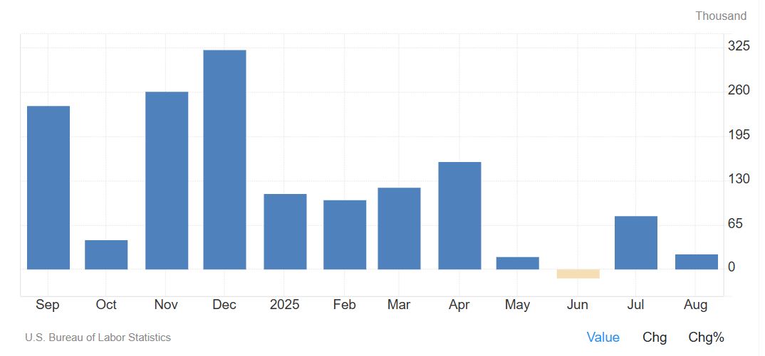 Passando all’esame dell’ultimo anno, il grafico in alto raffigura la creazione netta di posti di lavoro su base mensile, dal settembre 2024 all’agosto 2025, derivata dalle stime del Bureau of Labor Statistics (BLS).