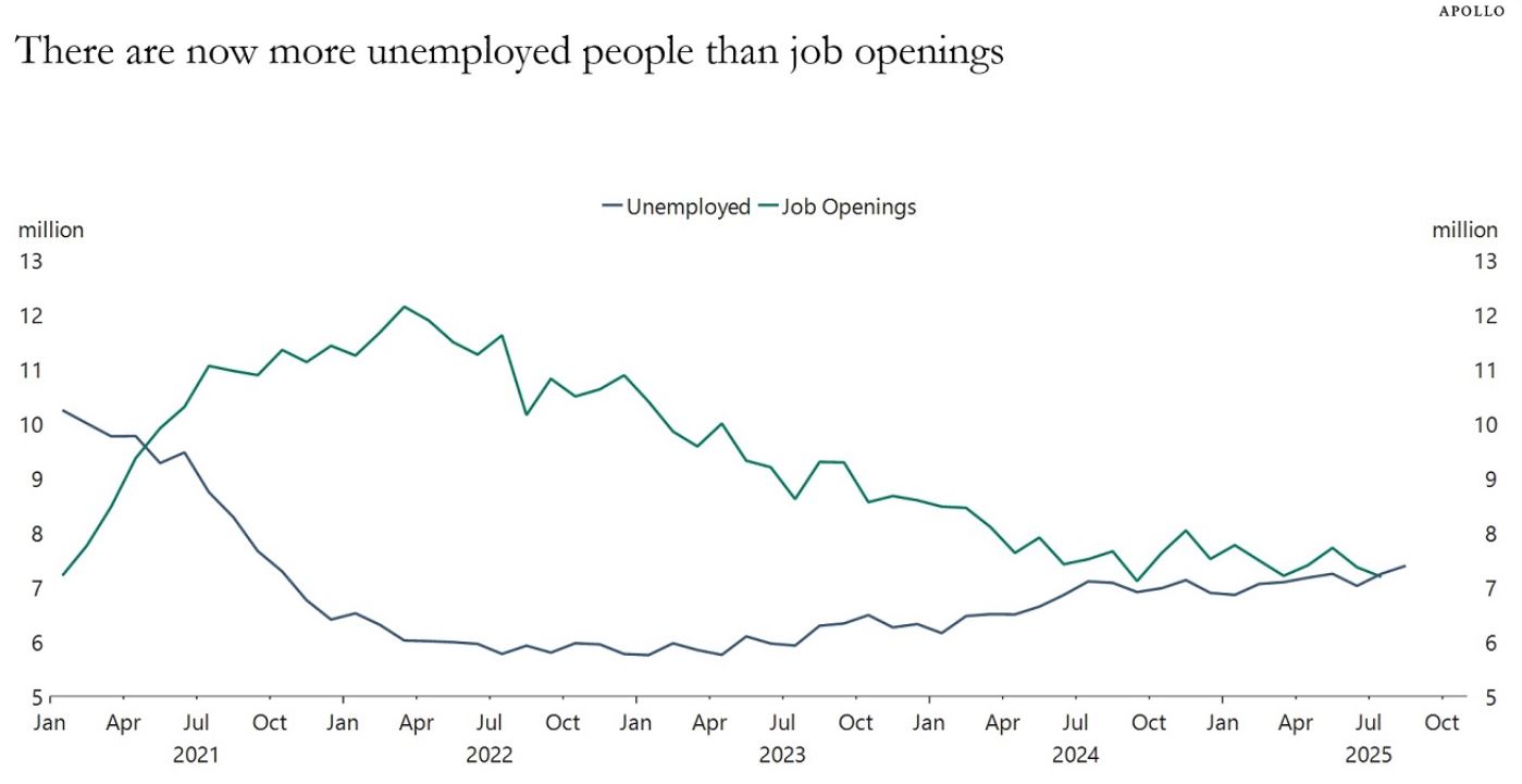 Di particolare rilievo, i dati del Job Openings and Labor Turnover Survey (JOLTS) per luglio indicano 7,2 milioni di aperture di posti, stabile ma in calo rispetto ai picchi pre-tariffe; contestualizzato con una forza lavoro di circa 171 milioni, ciò implica che il numero di disoccupati (circa 7,4 milioni, assumendo un tasso del 4,3%) ha ora superato le opportunità disponibili, invertendo il rapporto di “mismatch” favorevole osservato fino al 2024 e segnalando un mercato del lavoro in transizione verso un equilibrio più precario.