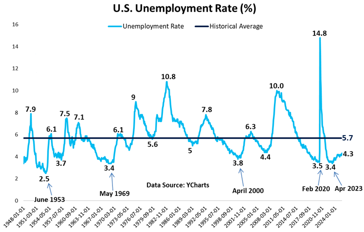 Partendo da questa premessa, procediamo con un’analisi dei dati più recenti sul mercato del lavoro statunitense, focalizzandoci sul tasso di disoccupazione complessivo. Il grafico sottostante illustra l’andamento di lungo periodo, dal 1948 a oggi, evidenziando un’anomalia strutturale che merita attenzione.