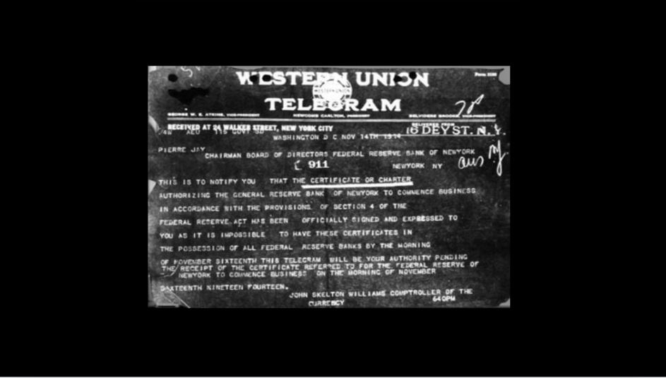 (Nell’immagine sotto, copia del telegramma originale ricevuto da John Skelton Williams, Controllore della Valuta, a Pierre Jay, Presidente del Consiglio di Amministrazione della Federal Reserve Bank di New York, che autorizza la Banca a iniziare l’attività il 16 novembre 1914).