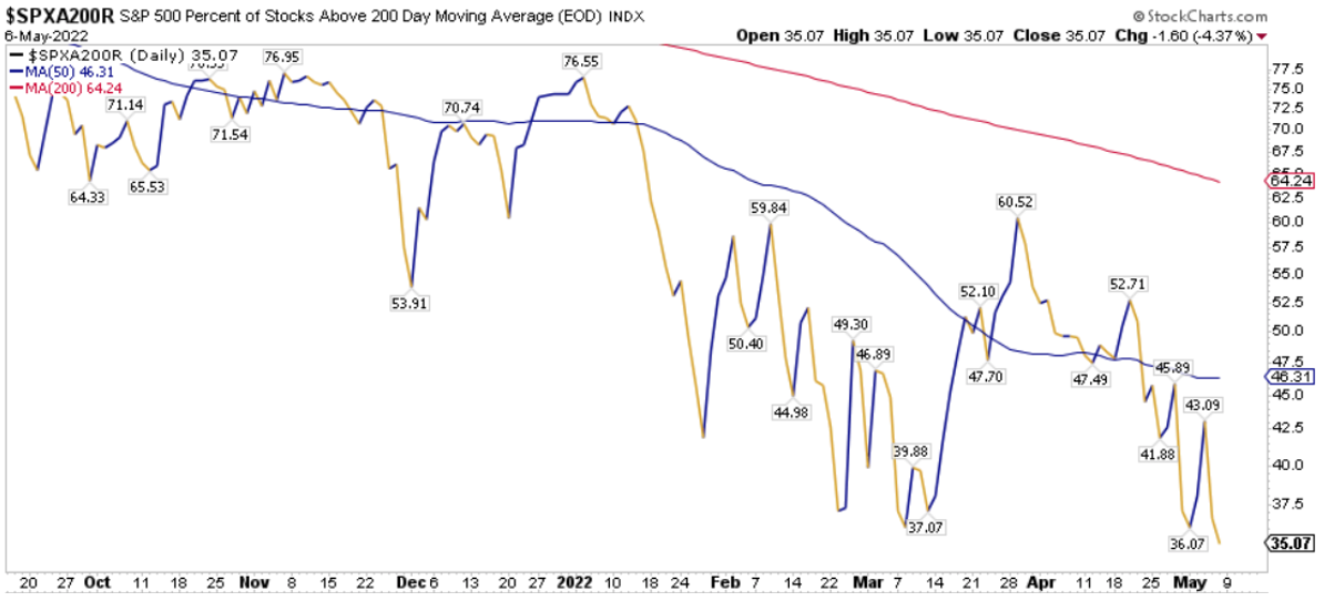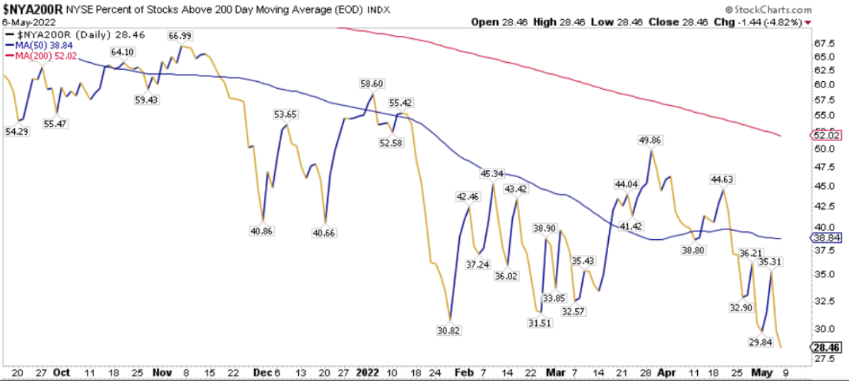 La percentuale dei titoli S&P500 scambiati sopra la loro media mobile a 200 periodi è pari al 35.07%, sul Nasdaq100 il 19.00% dei titoli prezza sopra lo stesso indicatore, mentre sul NYSE la percentuale è pari al 28.46%.